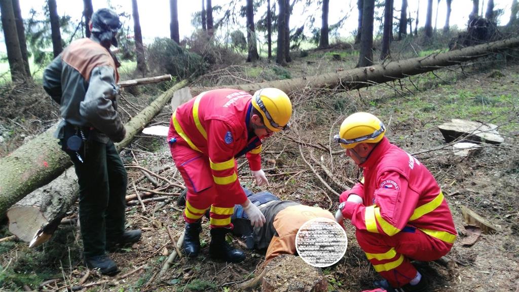 Devětatřicetiletý dělník byl při kácení stromů v lese zavalen padajícím kmenem. Po události zůstal při vědomí, utrpěl však vážné poranění v oblasti hrudníku, zad a pánve. Vrtulník ZZS vzlétl s veškerým vybavením pro případ potřeby zásahu v podvěsu. Stroj však nakonec mohl přistát na louce, ve vzdálenosti jen několika desítek metrů od samotného místa události.