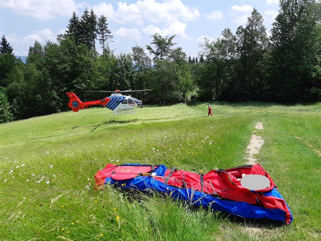 V nepřístupném lesním terénu tam došlo při kácení stromu k zavalení pětapadesátiletého muže kmenem, který jej několik metrů valil pod sebou. Následně postižený ještě sklouzl dolů ze svahu. Posádky zlínské ZZS poskytly přednemocniční neodkladnou péči, vzhledem k nepřístupnému terénu a podezření na vážné poranění v oblasti páteře, přivolali k zásahu ostravské letecké záchranáře. Specialisté LZS slanili k pacientovi a s pomocí podvěsu jej vyzvedli z místa úrazu. Poté byl převzat na palubu stroje. Po dalších úkonech vrtulník muže šetrně přepravil do ostravské Fakultní nemocnice. Předán byl do péče lékařů tamního urgentního příjmu.