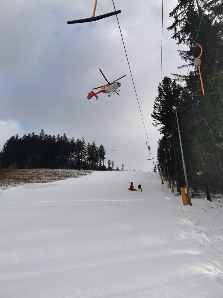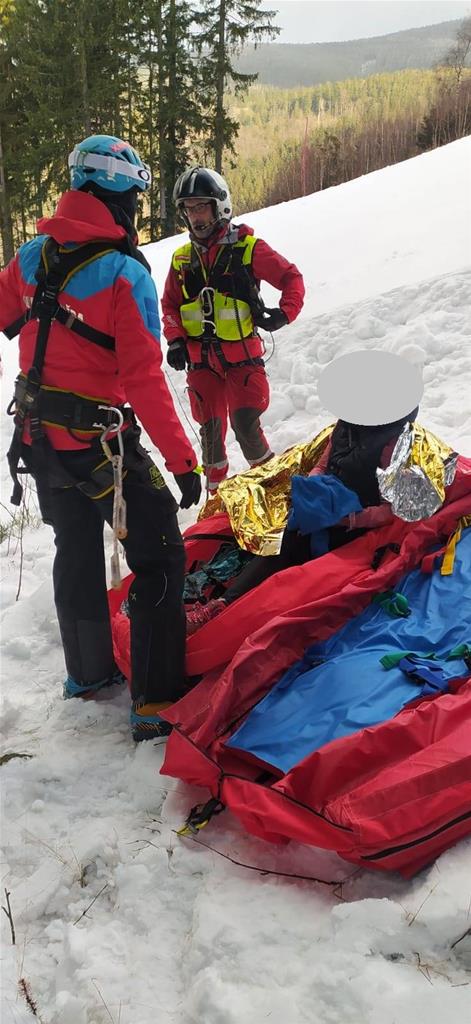 Čtyřiatřicetiletá žena uklouzla jako turistka na Medvědí stezce na sjezdovce v Malenovicích a poranila si dolní končetinu. Obsluha lyžařského vleku se pokusila o její transport na saních, který pro však pro zcela zledovatělý svah nebylo možné provést. Na místě spolupracovala také Horské služba Beskydy, ale vzhledem k podmínkám byla nutná evakuace pacientky pomocí vrtulníku a palubního jeřábu. Záchranáři ji přeložili do transportního vaku, vyzvedli a transportovali na rovnou plochu pod sjezdovkou, kde byla žena převzata na palubu stroje a následně přepravena do ostravské Fakultní nemocnice.