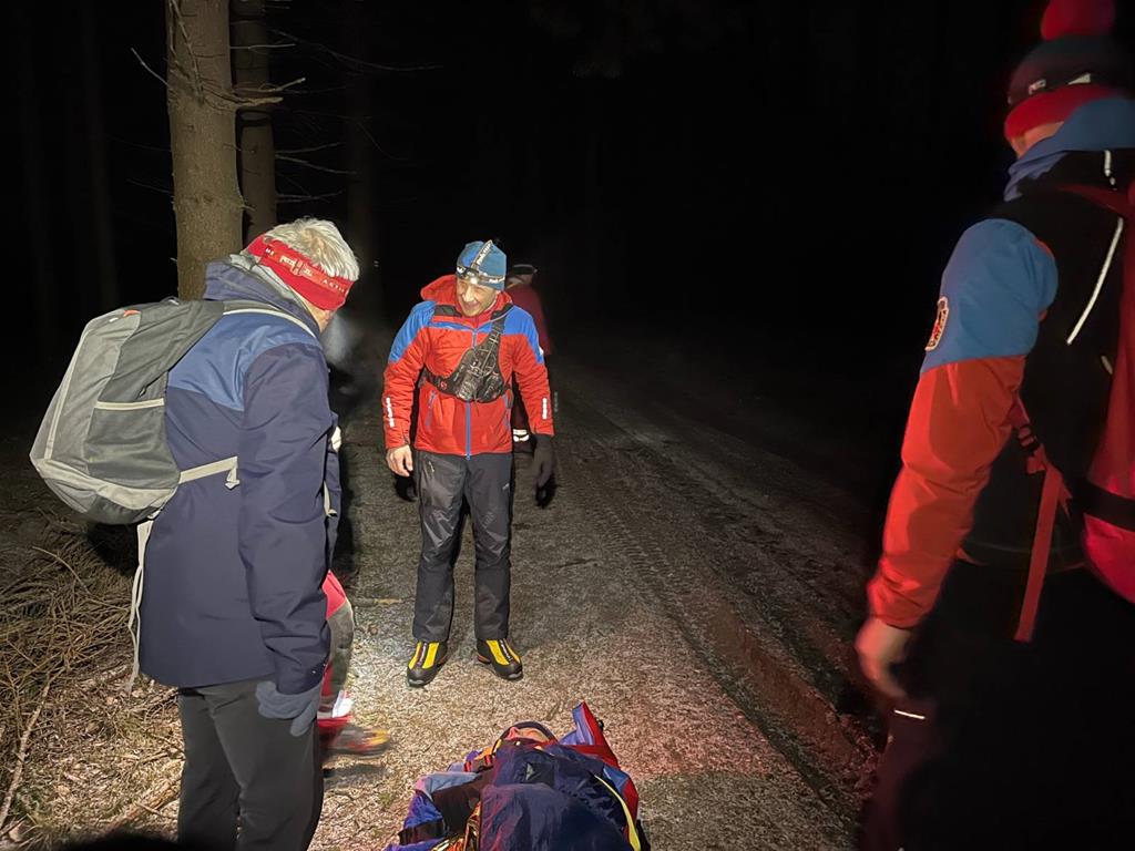 Před sedmnáctou hodinou vzlétal vrtulník k další misi. Jednašedesátiletá žena uklouzla, upadla a zranila se na turistické značce v nepřístupném a zledovatělém terénu. Zasahovala u ní horská služba, ale komplikovaný transport z místa události by po zemi zabral několik hodin. Pilotovi LZS se s použitím brýlí pro noční vidění podařilo přistát v setmělém terénu asi kilometr od pacientky. Záchranáři zajistili zraněnou končetinu do dlahy, uložili ženu do podtlakové matrace, a za pomocí vyprošťovacího rámu ji pak společnými silami přepravili k vrtulníku. Následně proběhl letecký transport do FN v Ostravě.
