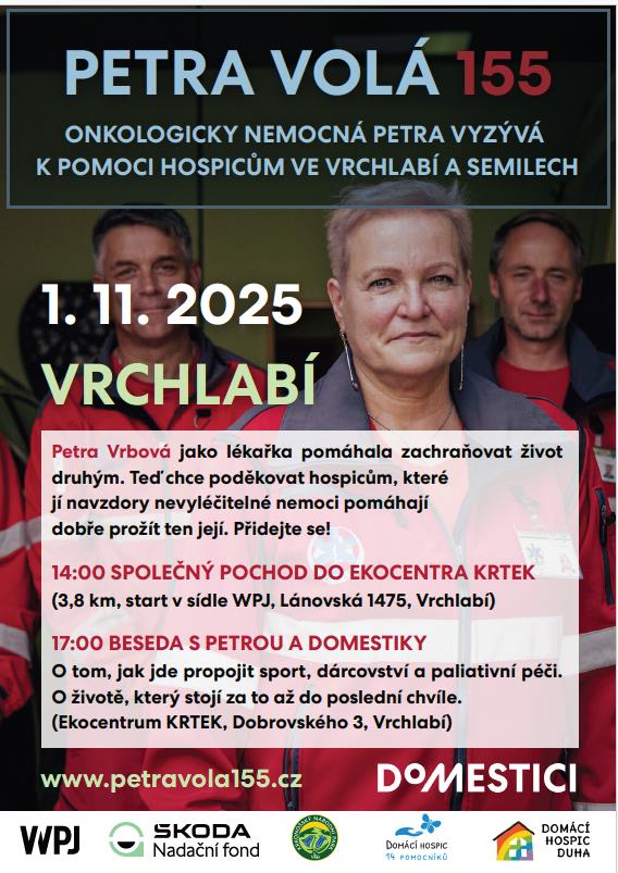 ZZS MSK sdílí výzvu Zdravotnické záchranné služby Libereckého kraje s prosbou o podporu dobročinné iniciativy „Petra volá 155“, kterou se rozhodla uskutečnit naše kolegyně MUDr. Petra Vrbová. Petra se od loňska potýká s těžkou diagnózou – karcinomem slinivky ve 4. stadiu s metastázami. Během náročné léčby jí zásadně pomohla péče hospicových týmů ve Vrchlabí a v Semilech. Díky nim se podařilo dosáhnout stabilizace a Petra zůstává aktivní a dál pomáhá druhým.
