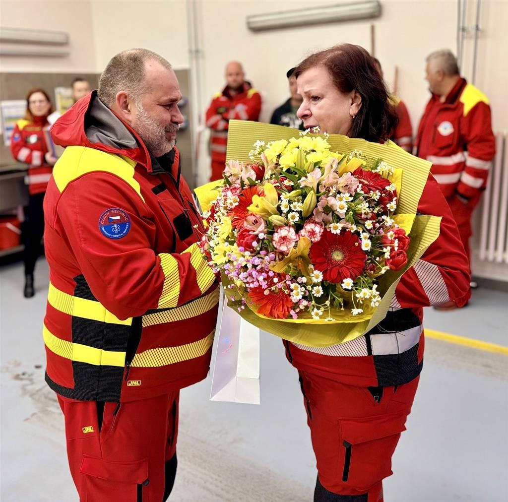 Na její poslední směnu v roli záchranářky se s ní přišli rozloučit a poděkovat za celoživotní práci nejen její blízcí spolupracovníci, ale také náměstek ředitele ZZS MSK, Bc. Jiří Flašar.