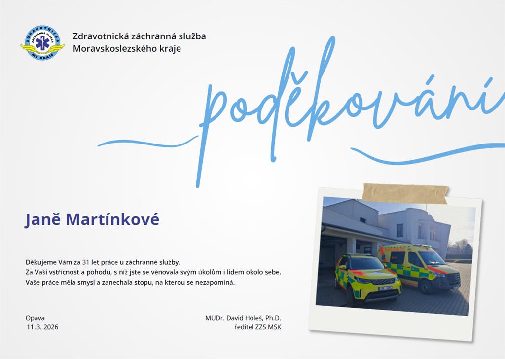 Záchranná služba se po jednatřiceti letech loučí s paní Janou Martínkovou. Nejezdila v posádce sanitky, přesto byla její práce pro provoz organizace nepostradatelná. Dlouhá léta působila jako asistentka ředitele záchranky v Opavě. Zastávala rovněž činnosti pracovnice pro pojišťovny a pokladní. Nyní odchází do zaslouženého důchodu, spolupracovníci na ni však budou vzpomínat jako na vždy ochotnou a vstřícnou kolegyni.